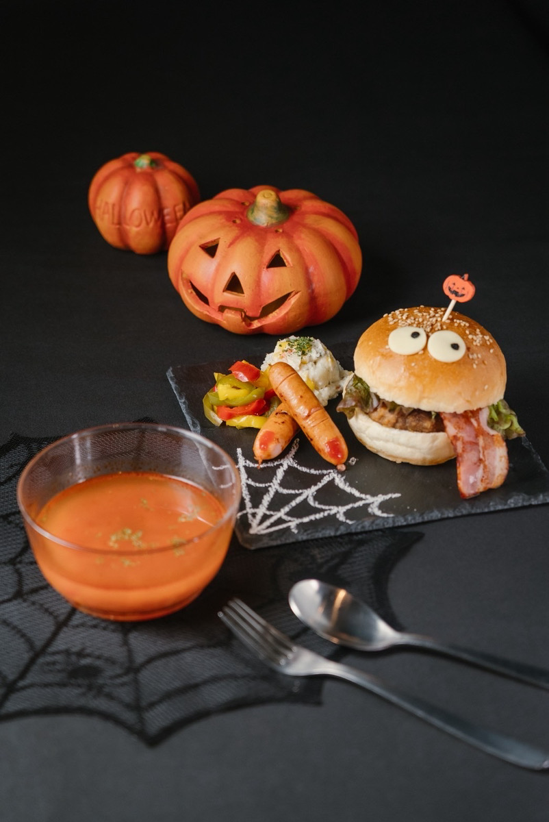 肉厚あるハンバーグに、じっくり煮込んだ和風オニオンソースとの相性抜群なハンバーガーがモンスターに大変身!スープと副菜がつき、指に見立てたウインナーはハロウィンを演出。わくわくするハロウィンの可愛さをお楽しみください。