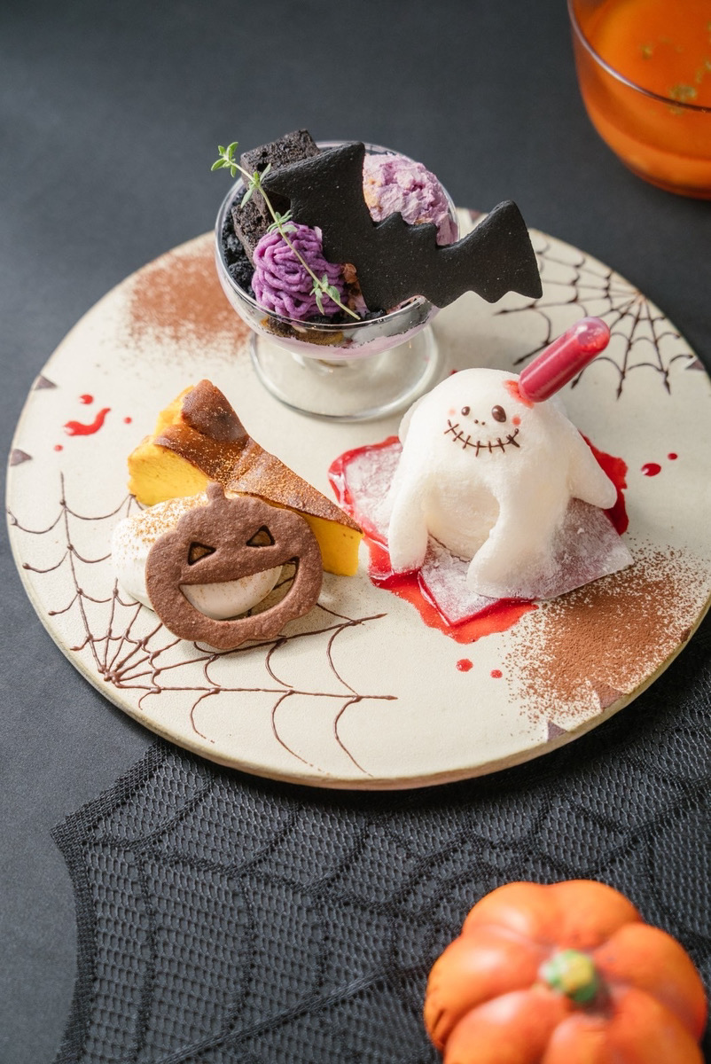 ハロウィン仕様の3種類のスイーツを盛り合わせたスイーツプレート。ねっとり濃厚なかぼちゃのバスクチーズケーキ・紫いもムースやクリームとアイスに、苦味のきいたブラックパウダーを使ったザクザククランブルやふわふわスポンジを組み合わせた紫いものミニパフェ・求肥に包まれたショートケーキ風オバケケーキはラズベリーソースでお好みのお味に。今しか出会えないハロウィンスイーツをお楽しみください。