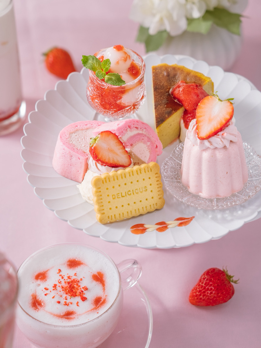 旬の甘酸っぱい苺を使ったスイーツを贅沢に盛り込んだ、可愛い見た目に心も満たさせるガーリーなスイーツプレート。カヌレ型のいちごムースの中にはいちごゼリー入り。ロールケーキは練乳を加えミルキーな味わいに。コクのある香ばしいピスタチオバスクは苺と相性抜群。白玉の入ったいちごスープの酸味は全体の味わいを引き立てます。春の訪れを感じる華やかなひとときをお過ごしください。