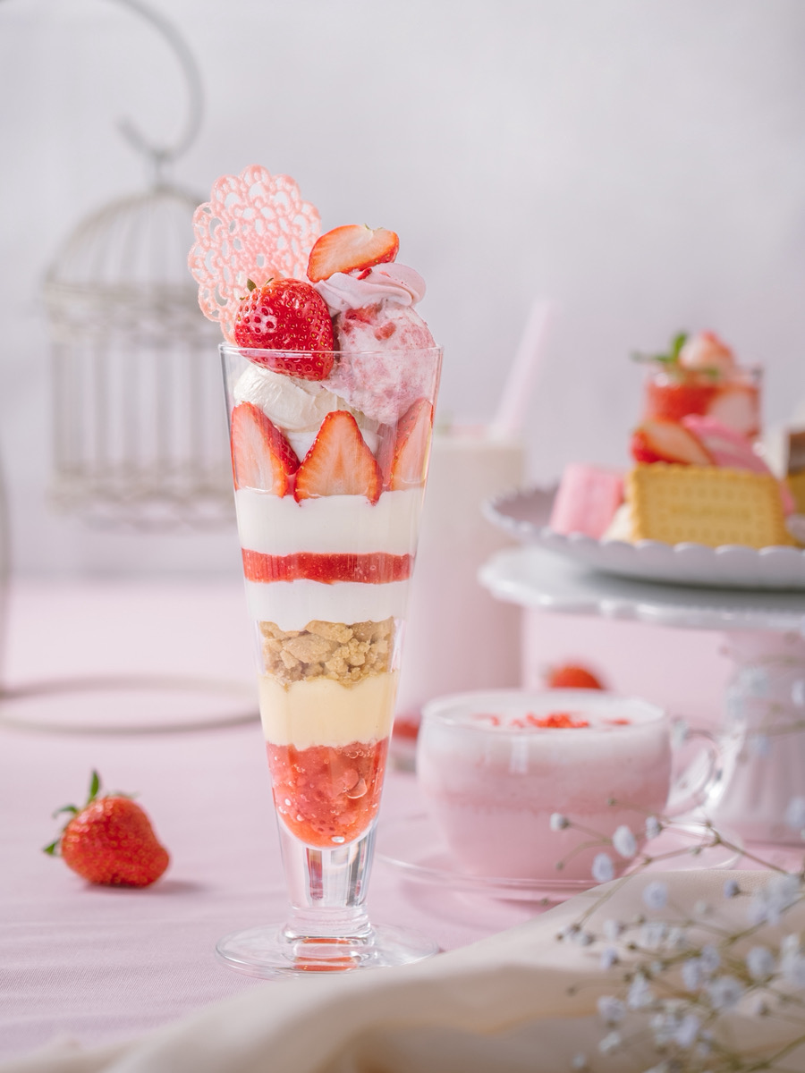 赤くて可愛い苺、苺味のピンクのラングドシャ、2種類アイスが乗ったインパクトのあるストロベリーパフェ。グラスの中にもフレッシュな苺をふんだんにあしらい、爽やかなマスカルポーネムース、口溶け滑らかなカスタードムースが苺の甘みと酸味を優しく引き立てます。様々な素材が口の中で優しく溶けあう、至福のハーモニーをご堪能ください。