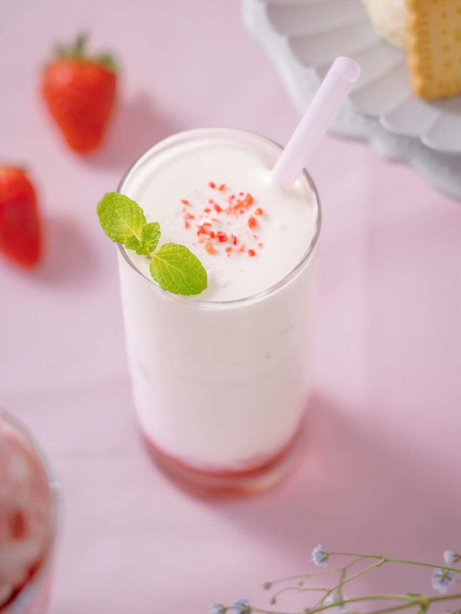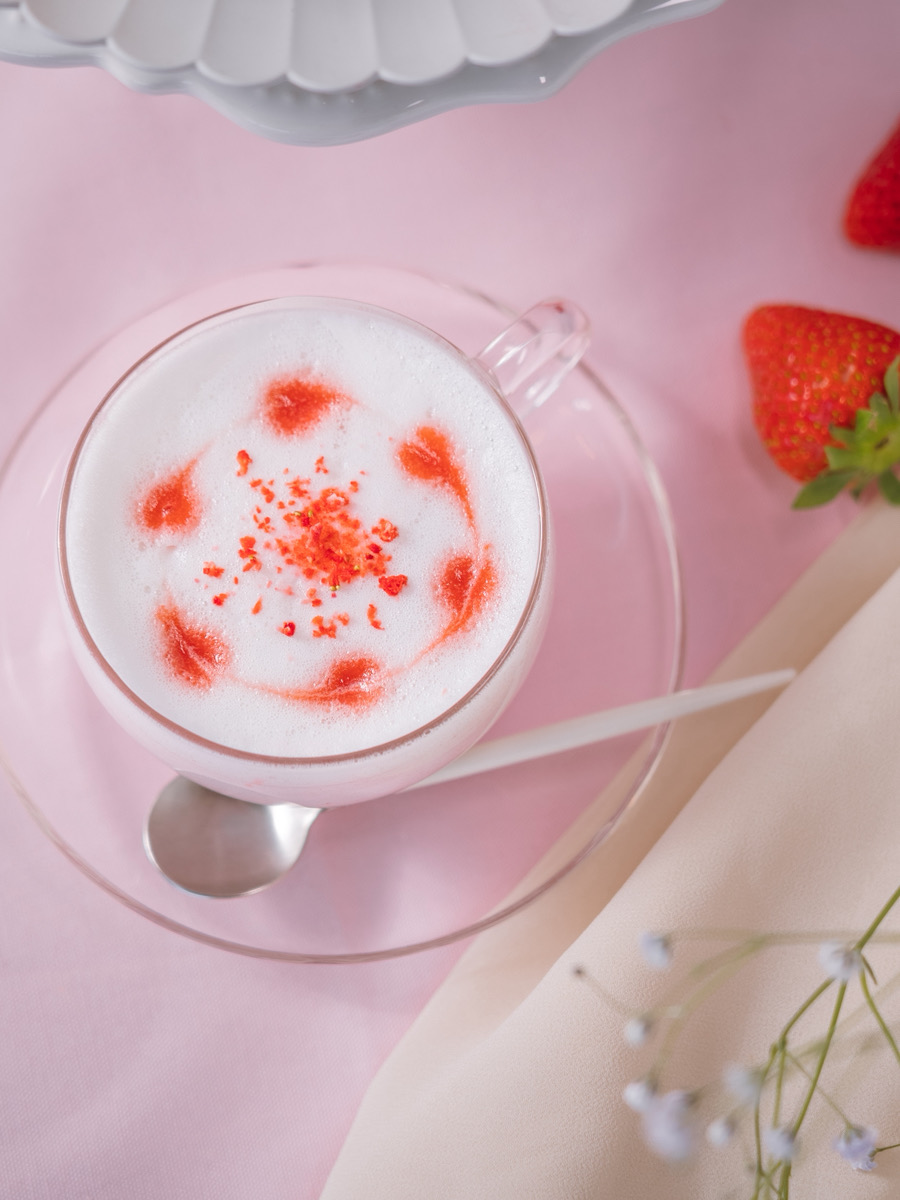 たっぷりの牛乳に、コンデンスミルクの濃厚な甘みと酸味のあるいちごのピューレの組み合わせ。ふわりと口いっぱいに広がる優しい甘さ。トップの可愛らしさが心も温まります。