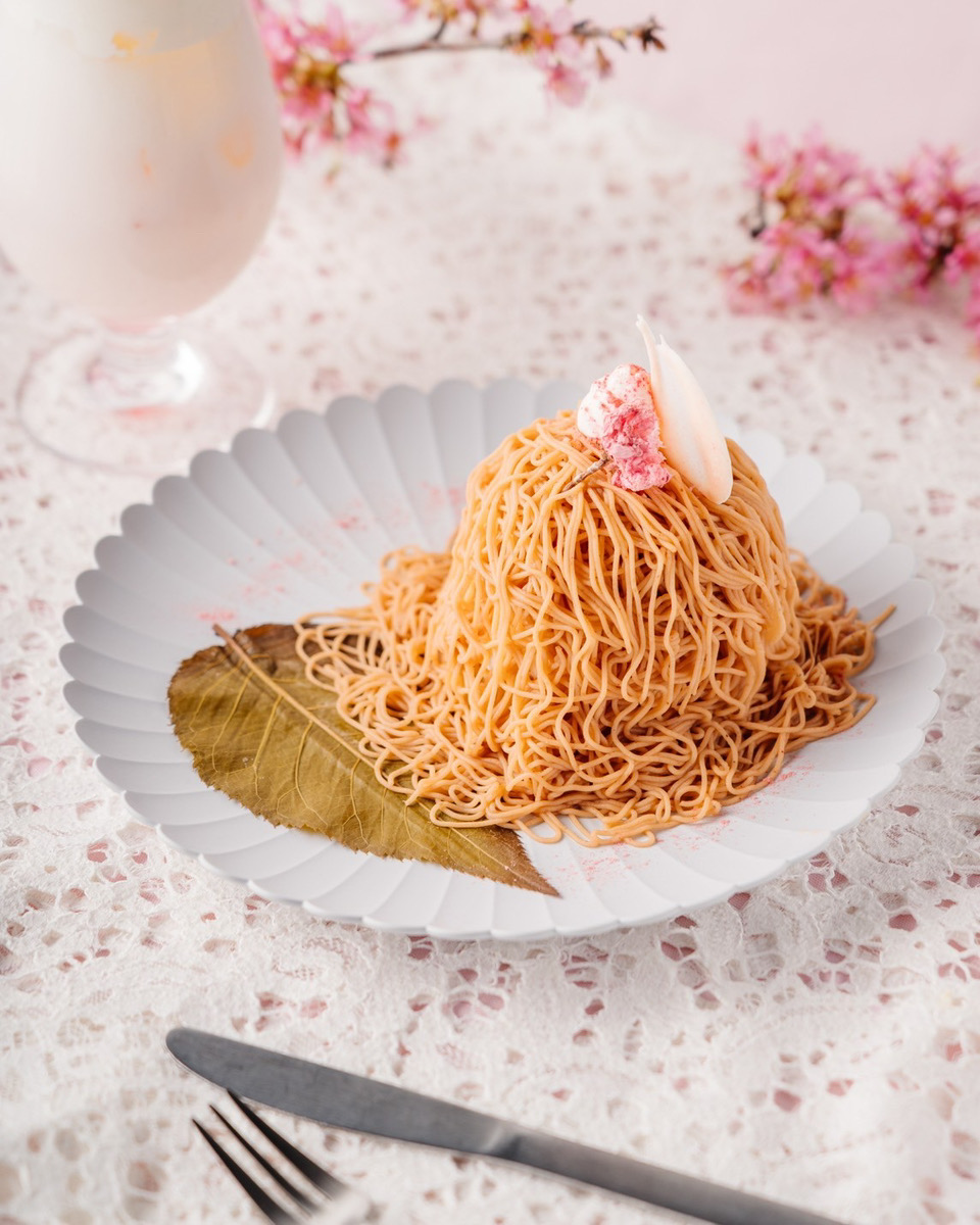 特製マロンクリームに桜餡を練りこんだ桜モンブランクリーム。中には生クリームと、甘酸っぱい苺を「苺大福」をイメージして桜餡と求肥で包みました。土台にはサクサクのパイを。桜の甘さとふんわり香るマロンとの味わい、箸休めのお漬物とご一緒にお楽しみください。