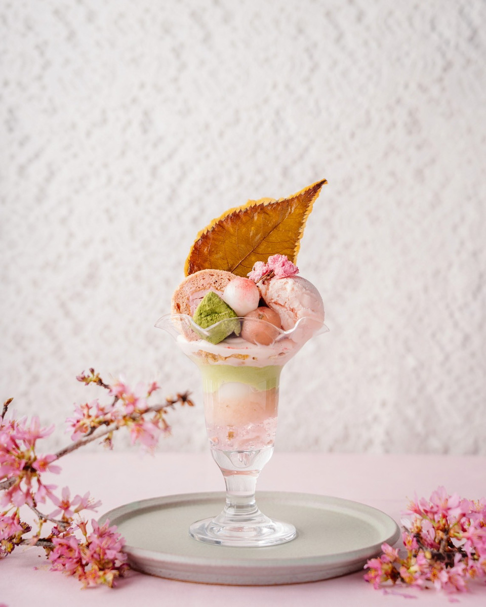 春らしい彩りの層には、桜の風味を引き立たせたパーツに、抹茶のムースでアクセントを。米粉を使用したふわふわの桜のロールケーキ、桜がふわっと香る桜のアイス、桜庭の塩気のあるラングドシャなどを贅沢に盛り付け。随所に散りばめた桜の味わい、優しい春の香りをお楽しみください。